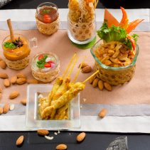 3. สะเต๊ะไก่กับน้ำจิ้มซอสถั่วอัลมอนด์: สะเต๊กไก่เนื้อนุ่มหอมเครื่องเทศนานาชนิด ปิ๊งย่างให้สุกหอม เสิร์ฟพร้อมกับซอสถั่วอัลมอนด์น้ำมะขาม