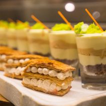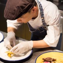 1. Roasted prime rib beef with seasonal vegetables & Sea bass fillet with saffron sauce: ซี่โครงเนื้อย่าง เสิร์ฟพร้อมกับผักตามฤดูกาล จับคู่กับ ปลากระพงย่างราดซอสสีเหลืองของหญ้าฝรั่น