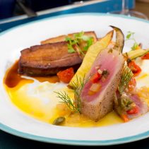3. Roasted pork belly with smoked eggplant, red onions and honey chilli sauce & Grilled red tuna with marinated tomatoes and tuna caper sauce: สเต็กหมูย่างสุดพรีเมี่ยมในซอสพริกน้ำผึ้ง เคียงคู่กับมะเขือยาวรมควันและมันสำปะหลัง จับคู่กับ ทูน่าย่างราดด้วยซอสเคปเปอร์