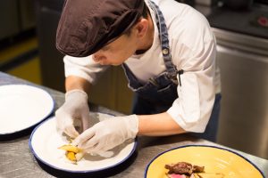 1. Roasted prime rib beef with seasonal vegetables & Sea bass fillet with saffron sauce: ซี่โครงเนื้อย่าง เสิร์ฟพร้อมกับผักตามฤดูกาล จับคู่กับ ปลากระพงย่างราดซอสสีเหลืองของหญ้าฝรั่น