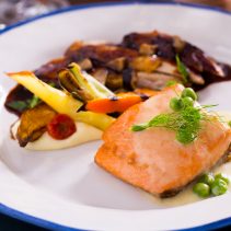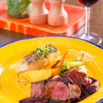 Roasted prime rib beef with seasonal vegetables and sea bass filled with saffron sauce.