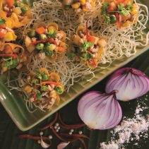 “This appetiser of days gone by is very hard to find these days and takes meticulous skill and patience to create. The golden krathong is filled with delectable bright bites and reminds me of meals and memories shared with my grandparents many years ago.”