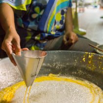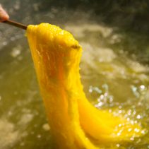 “ฝอยทอง ขนมไทยดั้งเดิมของร้านเรามาจากสูตรโบราณสืบทอดต่อกันมาภายในครอบครัว โดยเริ่มแรกต้องตีไข่แดงจำนวน 30 ฟอง ผสมกับไข่ขาวจำนวน 1 ขีด จากนั้นนำไปกรองผ่านผ้าของเหลว และเทลงใส่กรวยที่เจาะรูปปลายท่อเพื่อทำเส้นด้ายของขนมให้มีขนาดเล็ก โรยไข่แดงผ่านท่อกรวยลงบนน้ำเดือดที่ผ่านการเคี่ยวต้มกับน้ำตาลเข้มข้น รอจนขนมสุกหอมสักพัก จึงตัดแบ่งเป็นชิ้นขนาดพอดีคำ และวางพักไว้เตรียมเสิร์ฟ” เจ๊ใหญ่ เจ้าของร้านขนมหวานเพชรบุรี ตลาดต้นพยอม